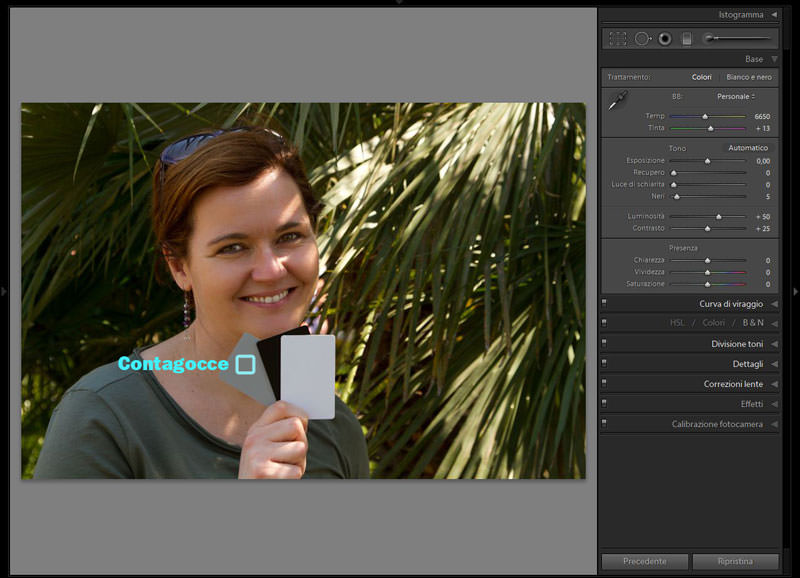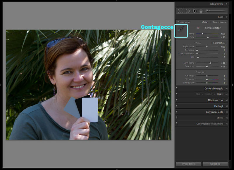 3. Attraverso lo strumento Contagocce si effettua una precisa lettura del bilanciamento del bianco direttamente sulla foto, cliccando su qualche elemento grigio chiaro. Se non ci sono si può inserire un apposito cartoncino in uno scatto di prova, da utilizzare poi in fase di elaborazione.