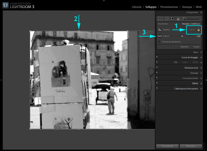 Spesso si manifesta la necessità di ritagliare (crop) le nostre foto. Sicuramente quando vogliamo impostare un taglio quadrato, dobbiamo ritagliare l’originale formato rettangolare: ma non solo. Mantenendo il formato orizzontale si può comunque decidere di eliminare alcune parti indesiderate o per migliorare la composizione. La risoluzione dell'immagine sul ritaglio rimane la stessa: cambiano però le dimensioni e quindi la qualità ovviamente si perde operando il ridimensionamento alle stesse dimensioni di stampa.